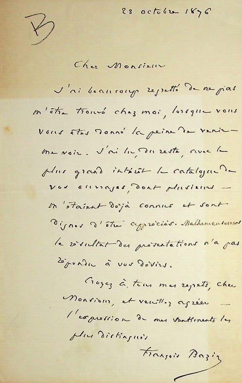 François Bazin (1816-1878), compositeur, pédagogue, Grand Prix de Rome. L.A.S., 23 octobre 1876, 1p in-8. « Cher Monsieur, J'ai beaucoup regretté de ne pas m'être trouvé chez moi, lorsque vous vous êtes donné la peine de venir me voir. J'ai lu, du reste, avec le plus grand intérêt le catalogue de vos ouvrages, dont plusieurs m'étaient déjà connus et sont dignes d'être appréciés. Malheureusement le résultat des présentations n'a pas répondu à vos désirs. Croyez à tous mes regrets, cher Monsieur, et veuillez agréer l'expression de mes sentiments distingués. François Bazin ». [394]