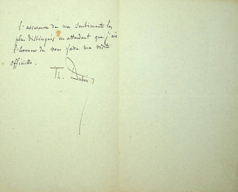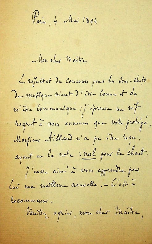 Théodore Dubois (1837-1924), compositeur, organiste. L.A.S., Paris, 4 mai 1894, 1p 1/2 in-8. « Mon cher Maître, Le résultat du concours pour les sous-chefs de musique vient d'être connu et de m'être communiqué ; j'éprouve un vif regret à vous annoncer que votre protégé Monsieur Aillaud n'a pu être reçu, ayant eu la note : nul pour le chant. J'eusse aimé à vous apprendre pour lui une meilleure nouvelle. C'est à recommencer. Veuillez agréer, mon cher Maître, l'assurance de mes sentiments les plus distingués en attendant que j'aie l'honneur de vous faire ma visite officielle. Th. Dubois ». Il s'agit peut-être de Théodore Aillaud (1859-1917), parolier. Il s'agit probablement d'un concours militaire. [395]