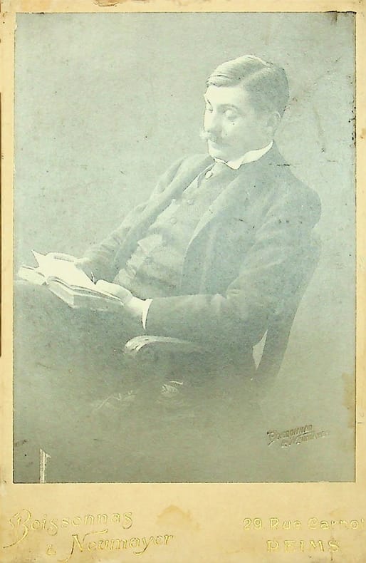 Pol Neveux (1865-1939), écrivain, bibliothécaire, membre de l'Académie Goncourt. Photographie cabinet, le représentant assis, un livre à la main. Photographie prise par Boissonnas et Neumayer à Reims (où il est né). Une note au dos indique « Pol Neveux à 35 ans ». Petites salissures. [395]