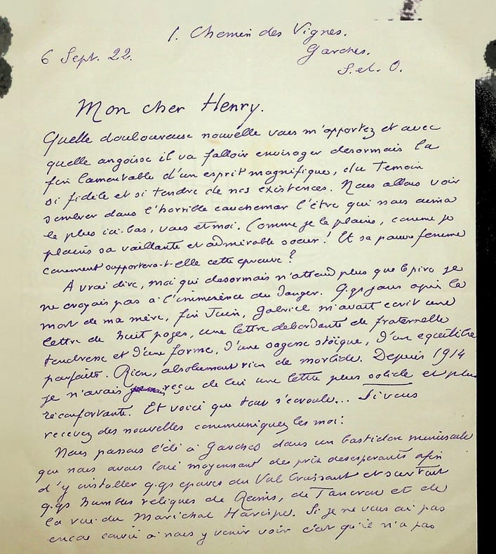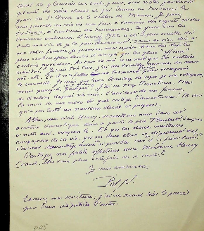 Pol Neveux (1865-1939), écrivain, bibliothécaire, membre de l'Académie Goncourt. L.A.S., 6 septembre 1922, 2p in-8. A l'écrivain naturaliste Henry Céard (1851-1924), membre de l'Académie Goncourt à qui succédera Neveux. Belle lettre notamment suite au décès de leur ami commun, Gabriel Thyébaut (1854-1922), l'ami des naturalistes mort le 4 septembre, se remémorant cet ami. Neveux parle aussi longuement de ses soucis de santé et de son état psychologique. [395]