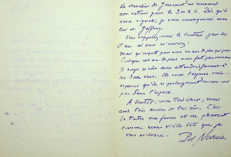 Pol Neveux (1865-1939), écrivain, bibliothécaire, membre de l'Académie Goncourt. L.A.S., sd [dimanche], 1p in-8. A l'écrivain naturaliste Henry Céard (1851-1924), membre de l'Académie Goncourt à qui succédera Neveux. « Mon cher Henry, Vous me voyez tout réconforté et tout heureux ! Mais comment n'eûtes vous pas la pensée étant si souffrant et seul à Paris de m'appeler auprès de vous. C'est très mal, mais votre convalescence vous épargne ma rancune ! Ne vous verrai-je pas avant votre départ pour Bourbon [Lancy] ? De toutes façons, faites-moi signe au moins dès votre retour. Dans un mois, je ne quitterai plus Garches, sauf peut-être qqs jours en septembre. Dites bien mes affections fidèles à madame Henry Céard et offrez lui mes plus chaleureuses félicitations pour votre glorieux rétablissement. Un paisible Bourbon, mon vieil Henry - à moins que je ne puisse vous embrasser d'ici là. Mais plus de blagues, nom d'un chien, et redevenez "d'attaque" : j'ai découvert un blanc de blanc fort honorable. De tout mon coeur. Pol N ». Belle lettre amicale. [395]