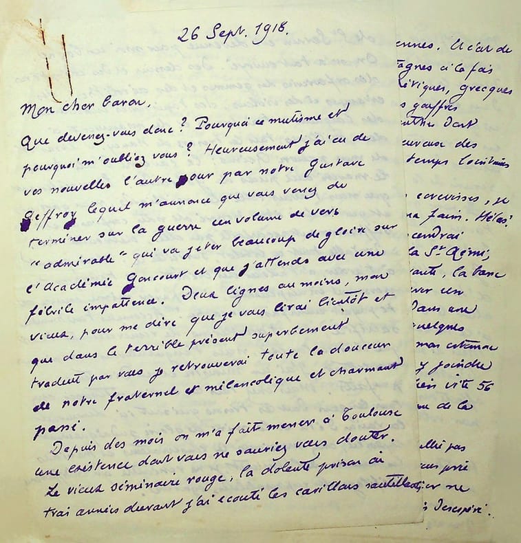 Pol Neveux (1865-1939), écrivain, bibliothécaire, membre de l'Académie Goncourt. L.A.S., 26 septembre 1918, 6p 1/4 in-8. A l'écrivain naturaliste Henry Céard (1851-1924), membre de l'Académie Goncourt à qui succédera Neveux. Très longue et belle lettre amicale, donnant longuement des nouvelles. [395]