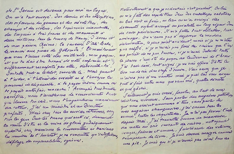 Pol Neveux (1865-1939), écrivain, bibliothécaire, membre de l'Académie Goncourt. L.A.S., 15 avril 1917, 4p in-4. A l'écrivain naturaliste Henry Céard (1851-1924), membre de l'Académie Goncourt à qui succédera Neveux. Très longue lettre donnant des nouvelles, faisant part de sa mélancolie, parlant de son travail, s'étalant longuement sur Reims, mentionnant leur ami Gabriel Thyébaut (1854-1922), . « L'impeccable et féroce anéantissement de Reims m'a achevé ». « Si je me suis fait collectionneur, c'est surtout pour entretenir avec un morceau de bois sculpté, avec un bout d'ivoire, la même tendre camaraderie que jadis avec mon cheval mécanique par exemple : tout âge a ses comparses ». Très belle lettre. [395]