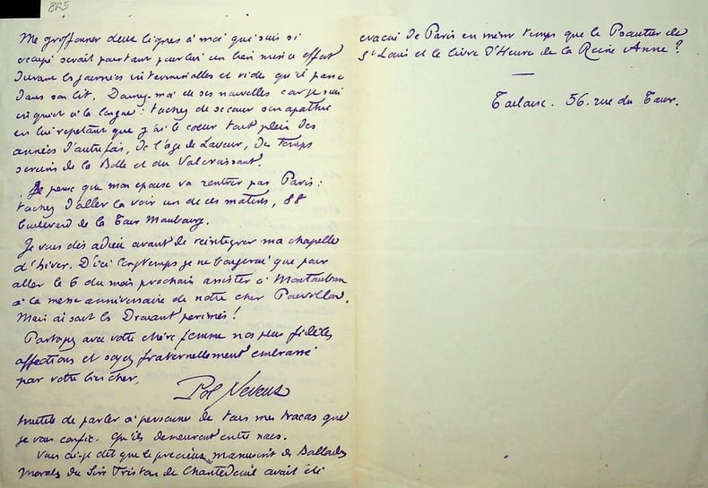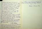 Pol Neveux (1865-1939), écrivain, bibliothécaire, membre de l'Académie Goncourt. L.A.S., sd [lundi soir, 1918], 1p in-4. A l'écrivain naturaliste Henry Céard (1851-1924), membre de l'Académie Goncourt à qui succédera Neveux, vraisemblablement pour le féliciter de son élection à l'Académie Goncourt. « Vite ! Vite ! Que je vous embrasse avec effusion, vieux baron de mon coeur. Quelle surprise joyeuse et quelle profonde émotion en lisant tantôt le journal ! Je suis heureux, franchement heureux et peut-être encore plus que vous. Voila réalisée une de mes plus anciennes et plus chères ambitions : la réparation d'une longue injustice et si vilaine et si stupide. Ma femme joint aux miennes ses plus affectueuses félicitations : partagez)en l'expression avec madame Henry Céard aux pieds de laquelle je vous prie de déposer mes très respectueux hommages. Nous voilà en "Perm" à Paris pour deux ou trois semaines. Mais nous ne sommes pas voisins : n'ayant plus de personnel et n'en trouvant pas pour si peu de temps, nous sommes venus demander l'hospitalité à mes beaux-parents, 17 rue Louis David. Cet éloignement ne m'empechera pas de vous joindre un de ces matins - vous et notre Gabriel. A bien donc car j'ai hâte de vous retrouver enfin ! Ah ! La "Belle Journée" !! Fraternellement, je vous serre dans mes bras. Pol Neveux ». Gabriel est Gabriel Thyébaut (1854-1922), ami commun des deux écrivains, ami de Zola. Papier jauni, un peu faible aux plis d'époque (ouvert au pli central). Très belle lettre amicale. [395]