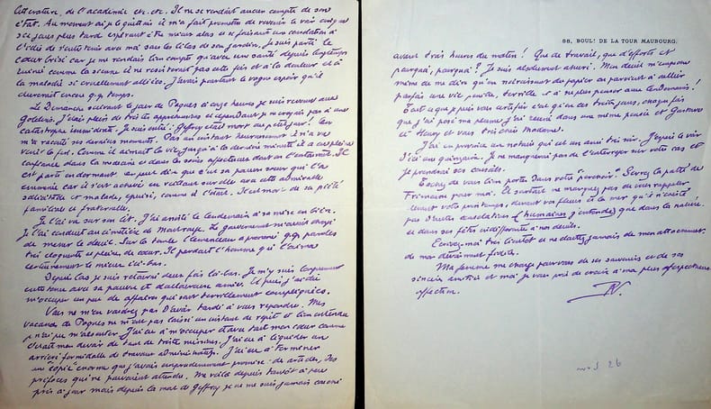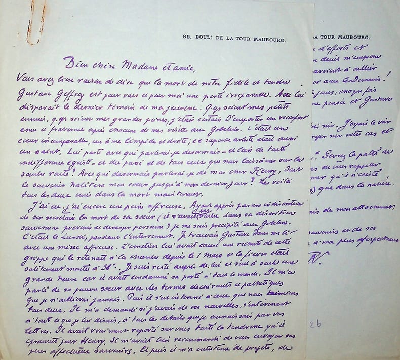 Pol Neveux (1865-1939), écrivain, bibliothécaire, membre de l'Académie Goncourt. L.A.S., sd [avril 1926], 3p in-4. A la veuve de l'écrivain naturaliste Henry Céard (1851-1924), membre de l'Académie Goncourt à qui succédera Neveux. Longue et belle lettre sur la mort de Gustave Geffroy , ses derniers jours, sa santé qui a décliné suite à la mort de sa soeur, sa visite le jour de Pâques (4 avril) alors que Geffroy vient de mourir au petit matin. Très belle lettre. [395]