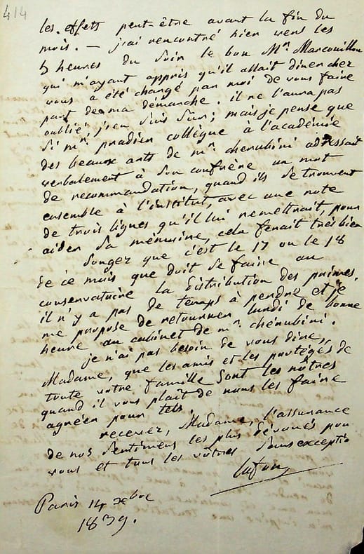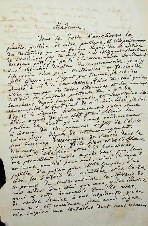 Pierre Rapenouille dit Lafon (1773-1846), fameux tragédien. L.A.S., Paris, 14 décembre 1839, 2p in-8. Très longue lettre à une dame à propos de sa protégée, mademoiselle Guyon. « Madame, Dans le désir d'améliorer la pénible position de votre protégée et indépendamment des tentatives que nous faisons auprès du Ministère de l'intérieur par la voie du très obligeant directeur des beaux-arts, j'ai pensé à la recommander chaudement à Mr Chérubini, direcreur du conservatoire. Je m'y suis rendu hier pour l'intéresser en faveur de Mlle Guyon ; ne l'ayant pas trouvé, je me suis adressé à Mr de Beauchesne, frère de celui qui est si bien connu par ses talens littéraires et son ouvrage intitulé les souvenirs poétiques &c. Mr de Beauchesne depuis longues années est secrétaire du conservatoire et fort aimé de Mr Chérubini. Je l'ai disposé à servir chaleureusement notre jeune élève auprès de son chef et lui obtenir la pension de 600f qu'on donne ordinairement à chacun des six premiers sujets de l'école qu'on juge dignes de cet encouragement. J'ai beaucoup d'espérance de succès dans la démarche que j'ai faite hier et de l'influence que Mr Chérubini et Mr de Berauchesne. » (Transcription du premier tiers de la lettre). Petit manque de papier. Deux mots ont perdu leur dernière lettre. Très belle lettre. [396]