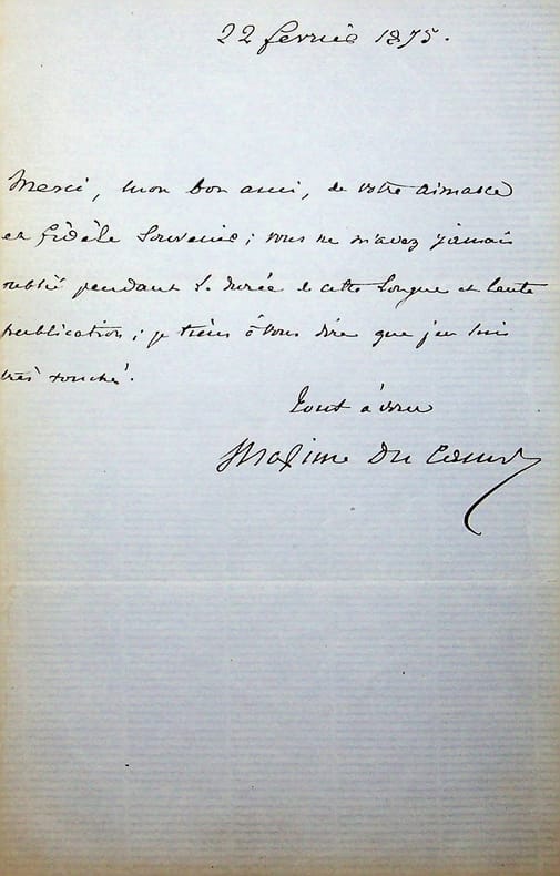 Maxime Du Camp (1822-1894), écrivain, membre de l'Académie française. L.A.S., 22 février 1875, 1/2p in-8. « Merci, mon bon ami, de votre aimable et fidèle souvenir ; vous ne m'avez jamais oublié pendant la durée de cette longue et lente publication ; je tiens à vous dire que j'en suis très touché. Tout à vous. Maxime du Camp ». [396]