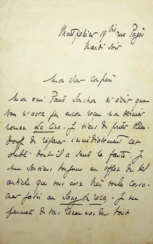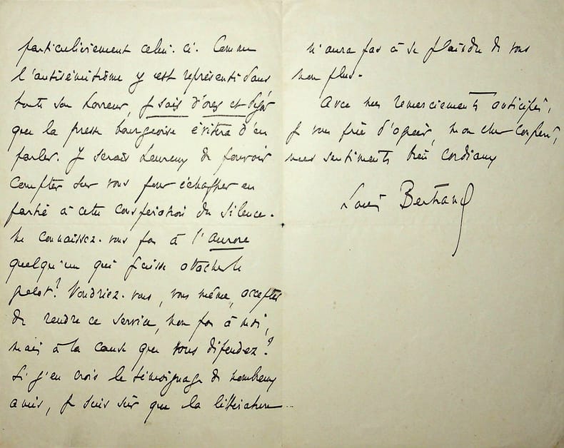 Louis Bertrand (1866-1941), écrivain, membre de l'Académie française. L.A.S., sd [mardi soir, 1901], 2p 1/2 in-8. Très belle lettre sur son deuxième roman, La Cina. Il va réparer l'oubli de son éditeur Ollendorff qui ne lui a pas envoyé un exemplaire, se souvient de l'article de son correspondant sur son premier roman Le Sang des races. Il précise, sur La Cina, « comme l'antisémitisme y est représenté dans toute son horreur, je sais d'ores et déjà que la presse bourgeoise évitera d'en parler ». [396]