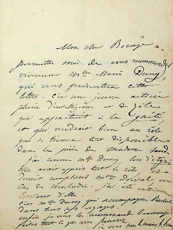 François Ponsard (1814-1867), poète, écrivain, membre de l'Académie française. L.A.S., sd, 1p in-12. A l'acteur, directeur de l'Odéon Pierre-François Touzé dit Bocage (1799-1862). Il lui recommande l'actrice Marie Durey, alors du théâtre de la Gaité. « c'est une jeune actrice pleine d'intelligence et de zèle » et qui voudrait jouer dans une pièce de George Sand. Nous n'avons pas trouvé trace de Marie Durey, qui avait été remplaçante de Marie Dorval, dans une pièce de George Sand. Toutefois, elle entra à l'Odéon et fit partie de la troupe de Rachel. [396]