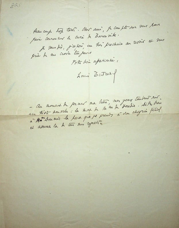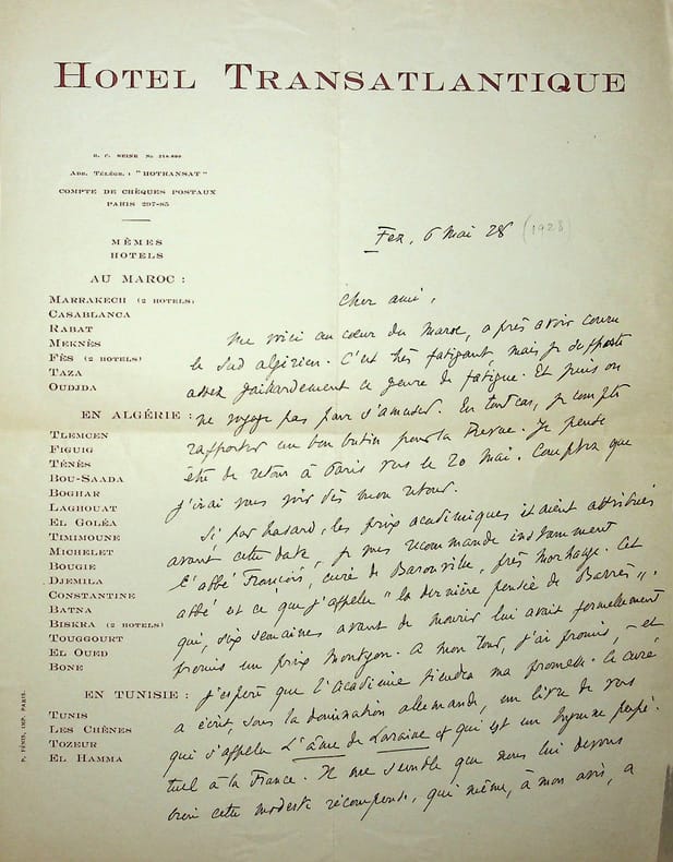Louis Bertrand (1866-1941), écrivain, membre de l'Académie française. L.A.S., Fez (Maroc), 6 mai 1928, 1p 1/2 in-8. Longue lettre, très certainement à un confrère de l'Académie française, pour donner son candidat au Prix Montyon, ne sachant s'il sera rentré à temps. Il s'agit de l'abbé Ernest François pour son livre L'âme de Lorraine. Il présente cet abbé comme « la dernière pensée de Barrès » (mort en 1923). Ernest François reçut un prix de 1000 francs. [396]