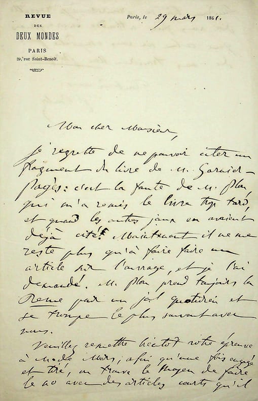François Buloz (1803-1877), patron de presse, fameux directeur de la Revue des deux Mondes. L.A.S., Paris, 29 mars 1861, 1p 1/4 in-8. Il ne peut citer le livre de Garnier-Pagès car Plon lui a remis le livre trop tard. Il s'agit très certainement du début de son Histoire de la révolution de 1848. [396]