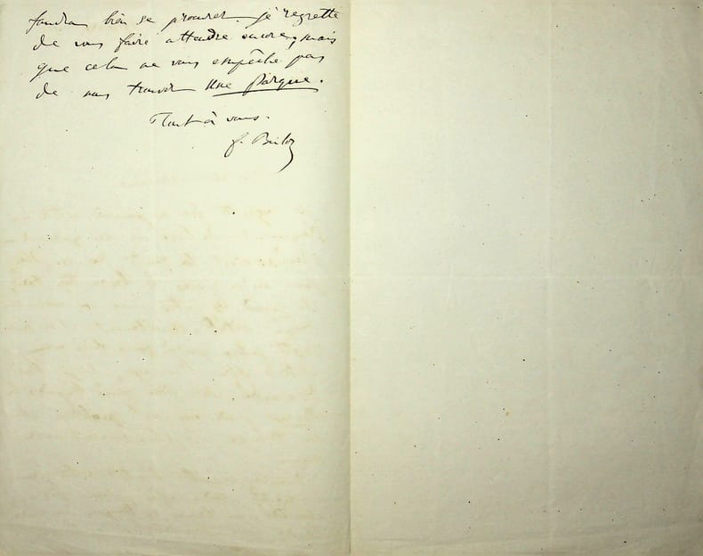 Lettre autographe signée de Félix Fénéon adressée à Gabriel Mourey, 18 lignes à l'encre noire, traces de pliure inhérentes à la mise sous pli de la lettre. Témoin et acteur privilégié de son époque, le critique d'art et collectionneur Félix Fénéon aide l'auteur Gabriel Mourey dans sa quête pourretrouver la correspondance de Paul Adam avec Maurice Barrès : "Le romancier et occultiste Paul Adam fut, comme vous savez, très lié à Maurice Barrès. (Candidats boulangistes dans deux circonscriptions lorraines contiguës, il firent fraternellement une campagne électorale et journalistique à laquelle leur amitié ne survécut guère.)Comment retrouver tous les papiers de Paul Adam, mort il y a une vingtaine d'années ? Mme Paul Adam vit-elle encore. - je n'en sais rien. Mais il est probable que vive une de ses soeurs, veuve depuis quelques trois ans de ce L. Cappielloauteur de tant d'affiches, - peintre elle aussi (et, de plus, fort sourde). Leur demeure était 8 rue Lechatelier, XVIIe. Par Mme L. Cappiello vous retrouverez peut-être des papiers barrésiens laissés par Paul Adam. Pour le cas où vous chercheriez dans cette direction, je note que que j'ai été en excellents termes avec toute la famille et que vous pouvez donc user de mon nom à votre gré." Personnalité majeure de l'Avant-garde, Fénéon avait le talent de débusquer les plus grands artistes. Cet étrange dandy volontairement discret, fit le vude servir quasi religieusement tout ce qui dans l'art forme une nouvelle sensibilité.Défenseur des néo-impressionnistes Seurat et Signac, ami de Mallarmé et de Camille Pissaro, de Paul Adam, Gustave Kahn, anarchiste puis communiste, directeur d'une douzaine de petites revues, il publia des uvres neuves telles les Illuminationsde Rimbaud, lePaludesd'André Gide,Dédalusde James Joyce. Prolifique journaliste, il écrivit partout et ne signa pas ses articles ou emprunta même des pseudonymes extravagants comme Gil de Bache, Porphyre Kalouguine, voire Thérèse ou Louise. Rare lettre de Félix Fénéon sur ses contemporains. Nous y joignions une lettre autographe signée de Fanny Fénéon, femme de Félix Fénéon, datée du 30 décembre 1941 alors que son mari était malade et alité, 10 lignes à l'encre noire, traces de pliure inhérentes à la mise sous pli de la lettre. "Mon mari gravement malade est dans l'impossibilité de recevoir quelqu'un. Si la difficultéque vous désirez lui remettre peut se résoudre par lettre, veuillez lui dire ce dont il s'agit. Une réponse immédiate vous montrera que malgré ses 80 ans, il est tout à votre disposition. [...]" - Photographies et détails sur www.Edition-Originale.com -