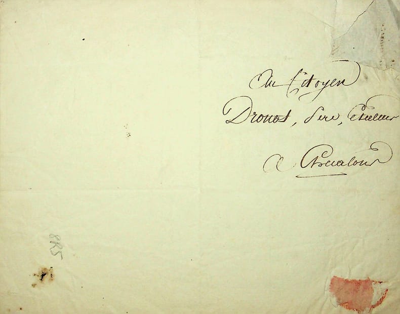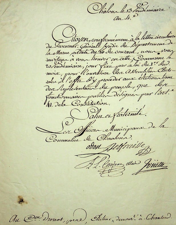 [Châlons en Champagne] Albin-Louis Grojean, maire de Châlons ; Louis-Joseph Delfraisse (1733-1828), Odon (?-?) et Joliette (?-?), membre du conseil municipal. P.S., Châlons, 13 vendémiaire an 4 [5 octobre 1795], 1p in-4. « Au citoyen Drouot, père, électeur, demeurant à Châlons » lui signalant l'ouverture des assemblées électorales le 20 vendémiaire (12 octobre). [397]