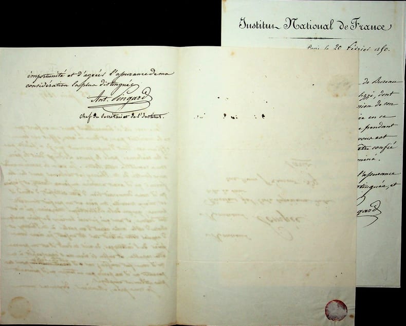 Antonius Pingard (1797-1885), huissier de l'Institut Royal de France [puis Institut National de France]. 2 L.A.S., 25 juin 1847 & 20 février 1850, 2p in-8. A Pierre-Philibert Pompée (1809-1874), homme politique. La première lettre est une recommandation pour un jeune Ledoigt, la seconde pour lui demander un ouvrage. [397]