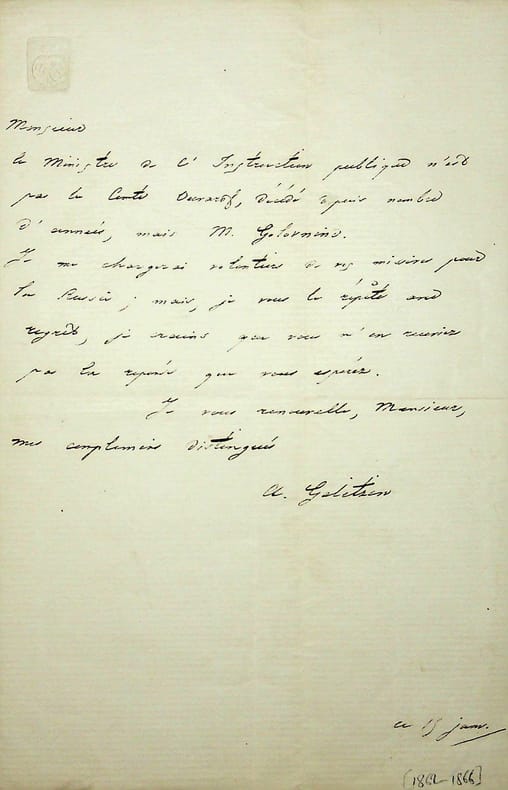 Augustin Galitzin (1823-1875), historien, polémiste. L.A.S., 15 juin [entre 1862 et 1866], 1p in-8. Il indique à son correspondant le nom du ministre de l'instruction publique russe qui est Alexandre Vassilievitch Golovnine (1821-1886) et non Sergueï Ouvarov (1786-1855) mort depuis plusieurs années. [397]