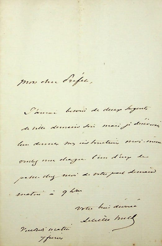 Achille Fould (1800-1867), banquier, homme politique. L.A.S., vendredi 7 février, 1p in-8. Il demande à un préfet deux sergents de ville pour le lendemain. [397]
