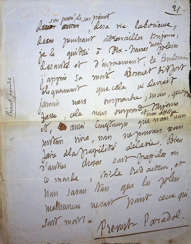 Lucien-Anatole Prévost-Paradol (1829-1870), journaliste, écrivain. Manuscrit A.S., sd, 1p in-4. Fin d'un long article (page numérotée 21). [397]