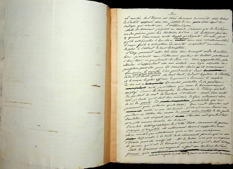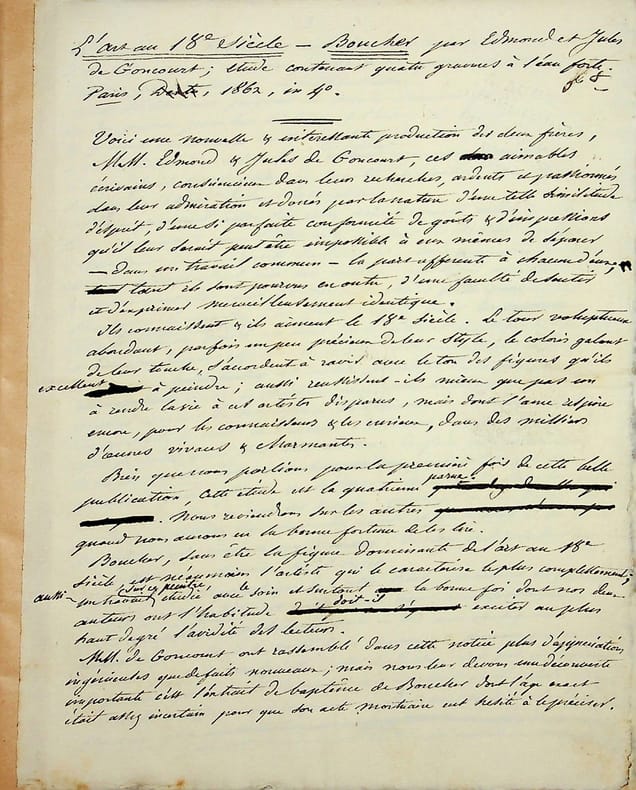 Albert Patin de La Fizelière (1819-1878), historien, biographe, critique d'art. Manuscrit A.S., sd [1862], 2p 1/2 in-4. Manuscrit, raturé, de son article sur l'ouvrage des frères Goncourt consacré au peintre Boucher. [397]