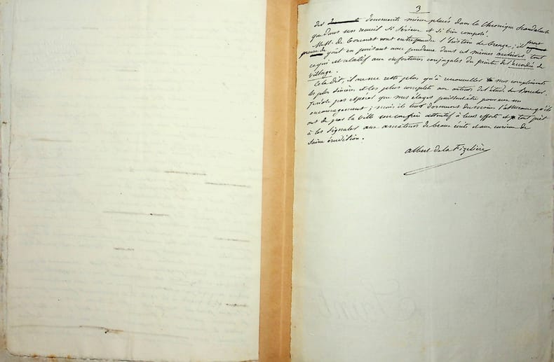 Intéressant manuscrit autographe signé par l'écrivain et critique Emile Perrin (1814-1885), alors ancien directeur de l'Opéra Comique (1848-1857) et futur directeur de l'Opéra (1862-1871) puis Administrateur général de la Comédie Française (1871-1885). On relève les annotations d'imprimeur (noms des typographes). Son analyse de Fidelio et la présentation de sa réception en France sont celles d'un critique très informé. Manuscrit provenant du fonds Dentu (l'éditeur Edouard Dentu prit la direction de la Revue Européenne de 1859 à 1862).