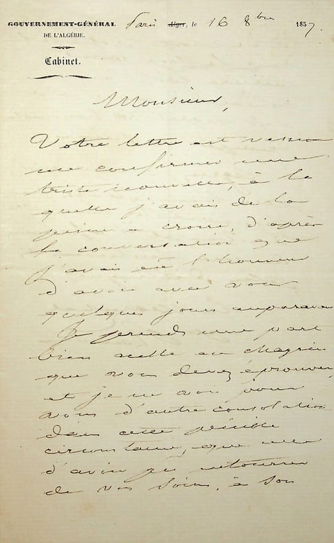 Jacques-Louis Randon (1795-1871), maréchal de France, homme politique. L.A.S., Paris, 16 octobre 1857, 1p 1/2 in-8. Lettre de condoléances. [397]