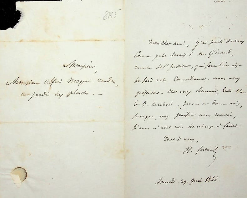 Hippolyte Fortoul (1811-1856), écrivain, homme politique. L.A.S., samedi 29 juin 1844, 1p in-12. Au médecin et botaniste Alfred Moquin-Tandon (1804-1863). Il a parlé de lui à M. Giraud, membre de l'institut qui souhaite le connaître et lui donne rendez-vous pour le lendemain. [398]