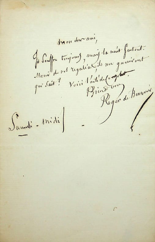 Etienne Roger dit Roger de Beauvoir (1807-1866), poète romantique, romancier, dramaturge. L.A.S., sd [samedi midi], 1/2p in-8. Peut-être à Henri de Villemessant. « Mon cher ami, Je souffre toujours, mais la nuit surtout. Merci de vos regal., ils me gueriront qui sait ? Voici l'article complet. Bien à vous Roger de Beauvoir ». Beauvoir avait une santé fragile. [398]