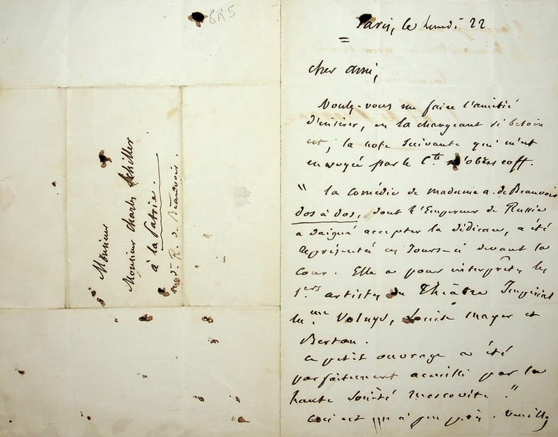 Léocadie Doze (1823-1859), comédienne, écrivain, épouse de Roger de Beauvoir. L.S. (nous ne la pensons pas autographe), Paris, lundi 22 [1852?], 1p 1/2 in-8. Au journaliste et écrivain Charles Schiller (1809-1879), journaliste à La Patrie. Elle lui envoie un compte rendu reçu d'un russe pour sa pièce Dos-à-dos qui a été jouée au Théâtre Impérial devant l'empereur de Russie. « Ce petit ouvrage a été parfaitement accueilli par la haute société moscovite ». Elle espère qu'il sera publié. [398]