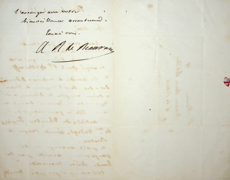 Édition originale rare et recherchée, exemplaire de première émission. Notre exemplaire est bien complet de la liste des souscripteurs et de l'avertissement qui furent supprimés lorsque le solde de cette édition passa aux mains d'un autre éditeur : Dion-Lambert et comprend bien la faute de pagination au tome 2 : Page 164 au lieu de 364. Enrichi d'une lettre de l'auteur avec sa signature autographe, rédigée et datée du 14 avril 1839, par son secrétaire. Une page à l'encre noire sur un double feuillet. Légèrement ombrée sur l'extrémité supérieure, avec quelques rousseurs, trois déchirures marginales sans atteinte au texte dûes au décachetage, et les plis habituels inhérents à l'envoi. Notre exemplaire est enrichi d'une exceptionnelle, prophétique et macabre lettre de François-René de Chateaubriand : "mais moi je suis mort, absolument mort et s'il me fallait écrire un mot dans un journal, j'aimerais mieux être enseveli à mille pieds sous terre." Signée de la main chancelante de l'auteur, cette lettre vraisemblablement inédite a été rédigée par son secrétaire : "Vous connaissez la main de [Hyacinthe] Pilorge que j'employe pour remplacer la mienne souffrante de la goutte" explique l'auteur en guise d'introduction à la lettre. Reliures en demi chagrin noir, dos lisses ornés de doubles filets dorés et doubles caissons estampés à froid, plats de cartonnage noir, très légers frottements sans aucune gravité sur certains plats, contreplats et gardes de papier à la cuve, tranches mouchetées, reliures de l'époque. Rousseurs éparses. * "Vous connaissez la main de Pilorge que j'employe pour remplacer la mienne souffrante de la goutte. Je vais lire avec un plaisir extrême vos souvenirs [] mais moi je suis mort, absolument mort et s'il me fallait écrire un mot dans un journal, j'aimerais mieux être enseveli à mille pieds sous terre. J'en ai fini avec la vie ; il me serait bien doux de ressusciter pour vous être utile [] Soyez bien sûr que personne ne prendra un intérêt plus réel et une part plus vive que moi à vos succès. Tout à vous du fond de ma tombe Chateaubriand le 14 avril 1839" Cette missive fut dictée par l'écrivain à son secrétaire, qui apporta une aide précieuse à l'élaboration même des Mémoires : « Demeuré au service de Chateaubriand pendant vingt-cinq ans, Hyacinthe Pilorge fut le principal artisan de la transcription desMémoires d'outre-tombe.Il avait pour mission de « mettre au propre » au fur et à mesure tout ce qu'écrivait ou dictait son patron.C'est à partir de sa copie que Chateaubriand pouvait ensuite se relire, puis se corriger ; et lorsque la nouvelle page se recouvrait à son tour de trop nombreuses ratures, Pilorge procédait à une nouvelle mise au net.C'est lui qui exécuta en 1840 la première copie intégrale desMémoires d'outre-tombe.Ce manuscrit représenta longtemps le texte de référence. C'est alors un ensemble de plus de quatre mille pages, regroupées par livres dans des chemises de carton, et où chaque feuillet pouvait être corrigé, déplacé ou remplacé à volonté. Ce travail achevé (en 1841), le mémorialiste laissa « reposer » son uvre pour quelque temps. Mais grâce à la souplesse de ce montage, lesMémoires d'outre-tombeont encore la vocation de rester une uvre ouverte, une sorte dework in progress. »(Bibliothèque nationale de France). Le destinataire de la lettre est lauteur de «Souvenirs » que Chateaubriand refuse ici de promouvoir. Lécrivain parle déjà depuis la tombe, presque dix ans avant sa fin : « mais moi je suis mort, absolument mort et s'il me fallait écrire un mot dans un journal, j'aimerais mieux être enseveli à mille pieds sous terre. J'en ai fini avec la vie ; il me serait bien doux de ressusciter pour vous être utile». Ces magistrales lignes sont empreintes dun humour souvent rencontré dans les pages des Mémoires, quAndré Lebois appellera «l'expression sarcastique de la dérision que répand sur nos actes la certitude de la mort [] L'humour est une armure, l'ultime rec