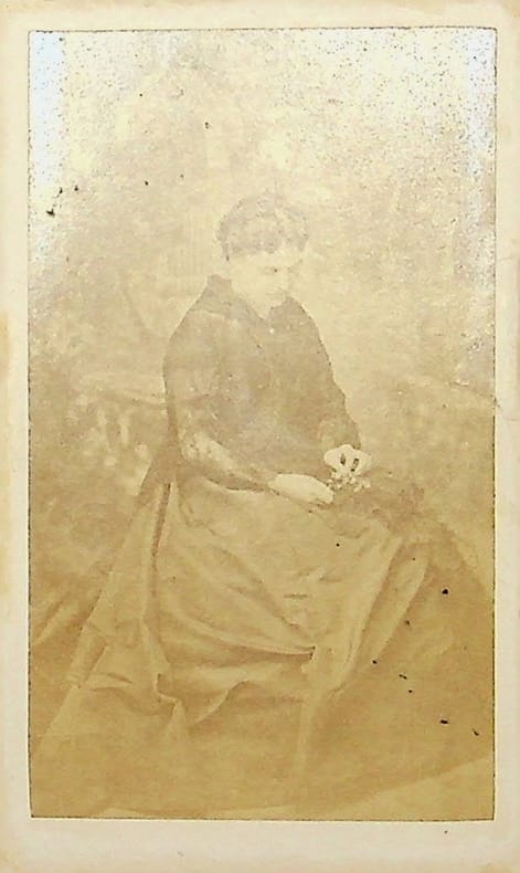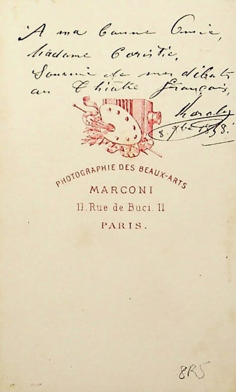 Caroline Duveau-Maubant (1832-1902), actrice de l'Odéon, dite Karoly. Photographie avec dédicace A.S., 8 septembre 1858, photographie CDV. La photographie est prise par Marconi à Paris et porte au dos la dédicace : « A ma bonne Amie madame Caristie. Souvenir de mes débuts au théâtre français. Karoly. 8 7bre 1858 ». Il s'agit probablement de l'épouse d'Augustin Caristie (architecte) ou son frère Philippe (ingénieur). [398]