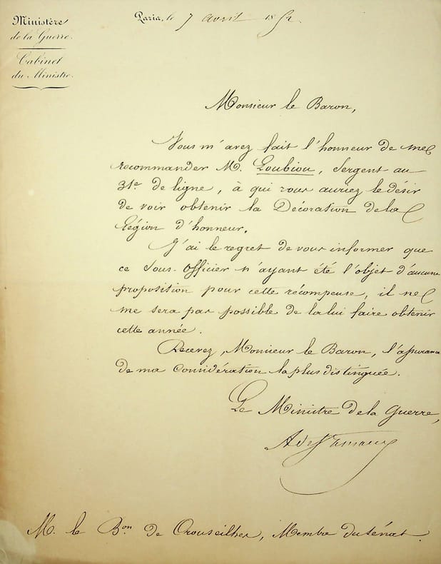 Arnaud-Jacques Leroy de Saint-Arnaud (1798-1854), maréchal de France, ministre de la Guerre. L.S., Paris, 7 avril 1852, 1p in-4. Au baron de Crouseilhes. Il ne peut faire obtenir la Légion d'honneur au sergent que lui a recommandé le baron. [398]