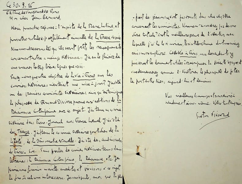 Gaston Picard (1892-1962), poète, écrivain, journaliste, cofondateur du prix Renaudot en 1926. L.A.S., 30 mars 1926, 2p in-8. A l'écrivain et avocat Jean-Bernard (1857-1936). Il le remercie pour la réponse à une enquête pour la Revue latine. Il lui signale que son chapitre de La Vie à Paris (l'ouvrage de Claretie continuée par Jean-Bernard) sur les courriers littéraires devrait être mis à jour, développant longuement ce point et notamment sa place en ce sujet. Petits trous dûs à une épingle. Intéressant courrier. [398]