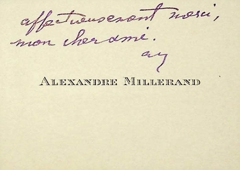 Alexandre Millerand (1859-1943), homme politique, ministre, président de la république. C.A.S., sd, 2 lignes. A l'écrivain et avocat Jean-Bernard (1857-1936). « affectueusement merci, mon cher ami. AM ». [399]