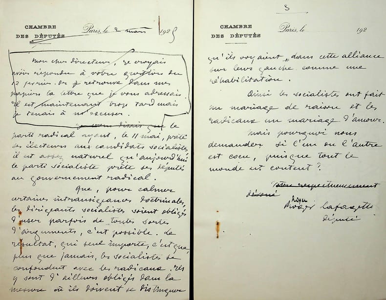 Raoul Lafagette (1883-1959), homme politique. L.A.S., 2 mars 1925, 3p in-8. A l'écrivain et avocat Jean-Bernard (1857-1936). Belle lettre sur l'alliance entre radicaux et socialistes, suite à l'arrivée des communistes à l'assemblée. « ainsi les socialistes ont fait un mariage de raison et les radicaux un mariage d'amour » Cette lettre semble avoir été publiée comme le montrent les parties barrées. Traces d'épingle rouillée. [399]