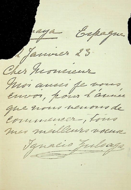 Ignacio Zuloaga (1870-1945), peintre espagnol. L.A.S., 2 janvier 1923, 1p in-12. A Arthur Meyer (1844-1924), directeur du Gaulois. Voeux pour la nouvelle année. Manque angulaire (timbre récupéré). [399]