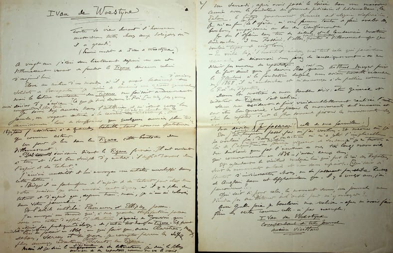 Henri Van de Woestyne dit Ivan de Woestyne (1834-1904), écrivain, journaliste. Manuscrit A.S., sd, 2p in-4. Courte biographie tournant autour du Figaro. [399]