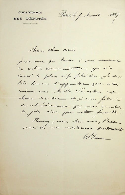 Daniel Wilson (1840-1919), homme politique, célèbre pour son implication dans le scandale des décorations. L.A.S., Paris, 5 avril 1887, 1p in-8. Remerciements et félicitations pour les fiançailles de son correspondant. [399]