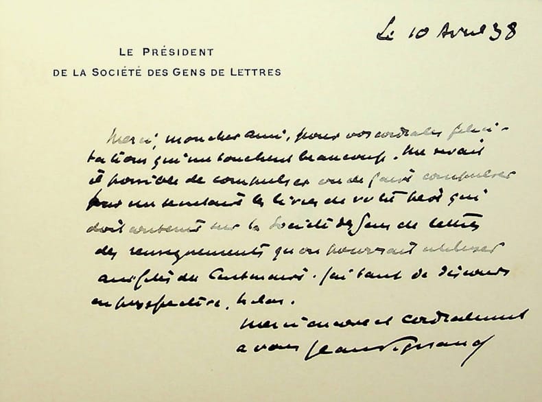 Jean Vignaud (1875-1962), écrivain, président de la Société des Gens de Lettres. L.A.S., 10 avril 1938, 1p in-12. Remerciements à un ami qui le félicite pour son élection comme président de la société. [400]