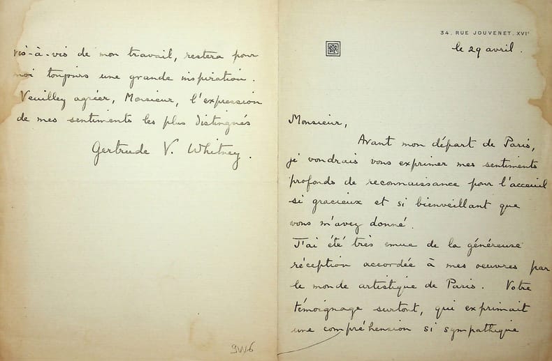 Gertrude Vanderbilt Whitney (1875-1942), sculptrice américaine, collectionneuse d'art, mécène. L.A.S., Paris, 29 avril, 1p 1/2 in-4. « Monsieur, Avant mon départ de Paris, je voudrais vous exprimer mes sentiments profonds de reconnaissance pour l'accueil si gracieux et si bienveillant que vous m'avez donné. J'ai été très émue de la généreuse réception accordée à mes oeuvres par le monde artistique de Paris. Votre témoignage surtout, qui exprimait une compréhension si sympathique vis-à-vis de mon travail, restera pour moi toujours une grande inspiration. Veuillez agréer, Monsieur, l'expression de mes sentiments les plus distingués. Gerturde V. Whitney ». Petite mouillure angulaire. [400]