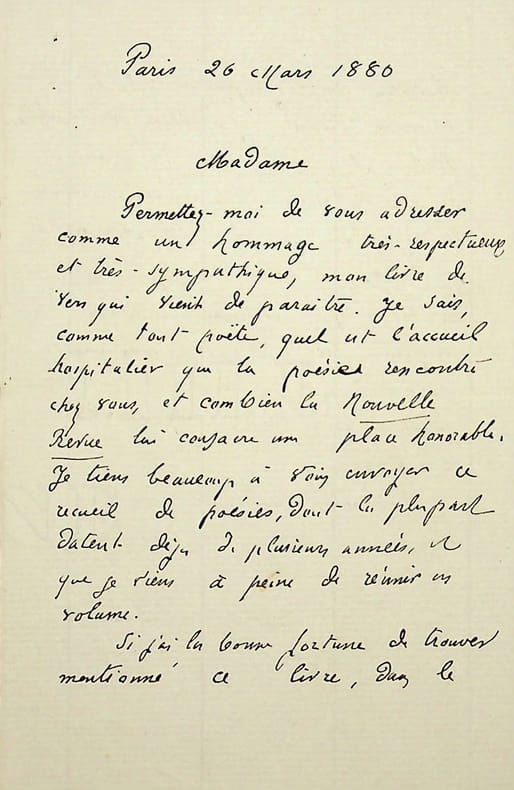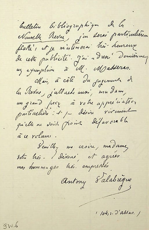 Antony Valabrègue (1844-1900), poète, critique d'art. L.A.S., Paris, 26 mars 1880, 2p in-12. Probablement à Juliette Adam (1836-1936). Il lui envoie un recueil de vers, probablement ses Petites poèmes parisiens (Paris, Lemerre, 1880), et serait très heureux que la Nouvelle Revue parle de son livre. [400]