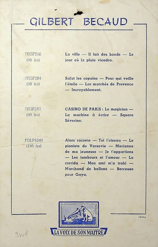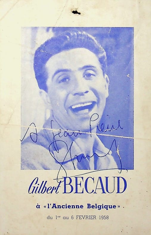 Gilbert Bécaud (1927-2001), chanteur, compositeur, pianiste, « Monsieur 100 000 volts ». P.S., 1958, 1p in-12. Flyer pour annoncer ses concerts à « l'Ancienne Belgique » du 1er au 6 février 1958 avec dédicace : « A Jean-Pierre, GBécaud ». Plis, trou de punaise. [400]