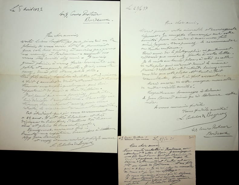 Léonce Cubelier de Beynac (1886-1942), poète, écrivain, « le périgourdin de Bordeaux ». Une médiathèque porte son nom à Manzac sur Vern. 3 L.A.S., 28 décembre 1936, 8 & 23 avril 1937, 1p in-12 & 2p in-4. A Alpi Jean-Bernard (1889-1948), avocat. Lettres amicales parlant notamment de ses enfants. [400]