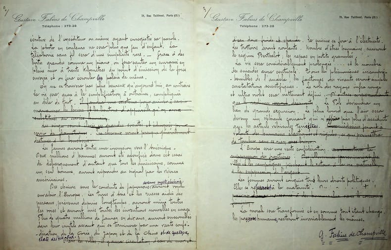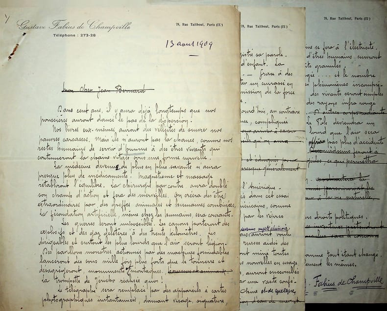 Gustave Fabius dit Fabius de Champville (1865-1946), magnétiseur, poète, écrivain, franc-maçon. Manuscrit A.S., 13 août 1909, 3p in-4. A l'écrivain et avocat Jean-Bernard (1857-1936). Il répond à une enquête sur « l'état de la France dans cent ans ». Selon lui, la médecine n'aura plus de médicaments, « magnétisme et massage rétabliront l'équilibre », la chirurgie aura fait des progrès immenses, « on créera des êtres extraordinaires par des greffes animales et humaines combinées », les guerres seront impossibles, « le télégraphie sera remplacé par des appareils à cartes photographiques instantanées », « la téléphonie sans fil sera d'une simplicité rare », « les Jaunes auront tenté une incursion vers l'Amérique », « des chinois auront voulu envahir l'Europe », « la cuisine se fera à l'électricité, les trottoirs seront roulants [.] les repas en petits granulés », « le nombre des suicidés aura centuplé », « L'Europe sera une vaste confédération », « Les femmes auront conquis tous leurs droits politiques. Elles se refuseront à la maternité ». Très beau document. [400]