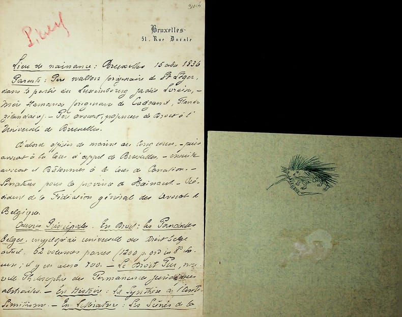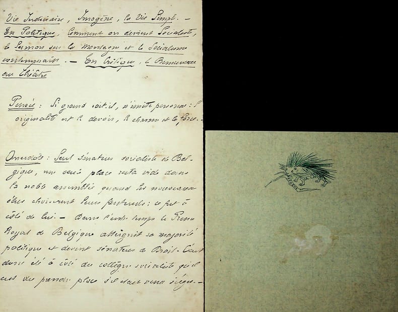 Edmond Picard (1836-1924), écrivain belge, jurisconsulte, théoricien de l'antisémitisme. Manuscrit autographe, sd, 2p in-8. Biographe de Picard : ses origines, ses oeuvres, une pensée et une anecdote en tant que seul sénateur socialiste. On joint son papier à lettre avec entête un hérisson et « je gêne », vierge, mais trace de colle. [400]
