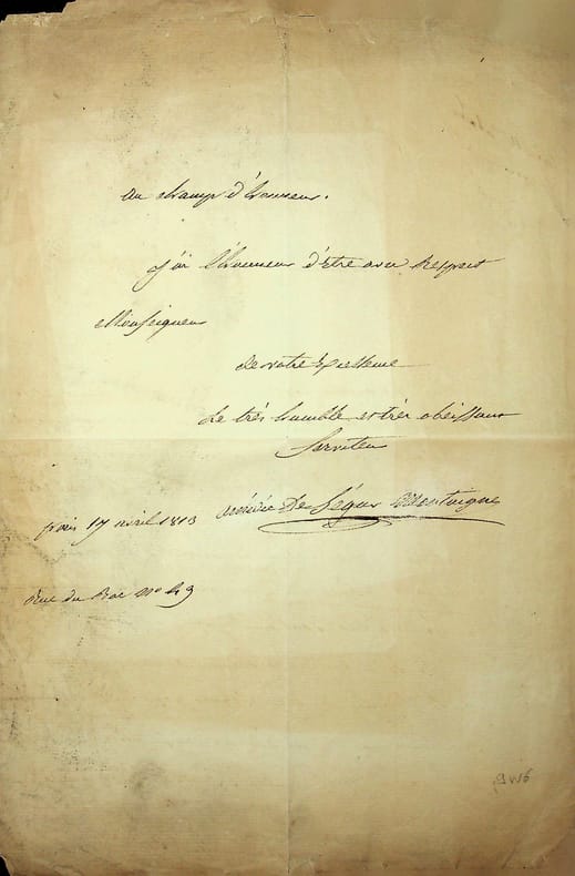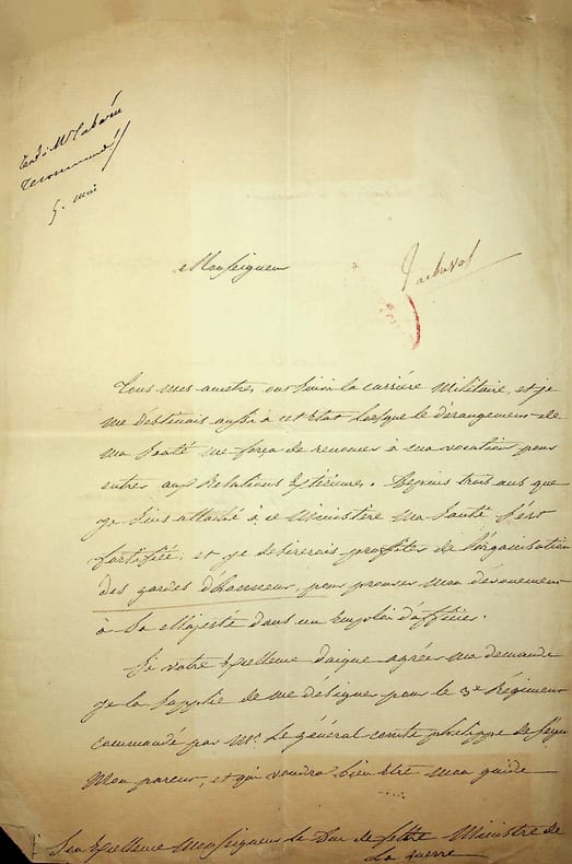 Amédée de Ségur-Montaigne (1790-1852), secrétaire de la diète germanique. L.A.S., Paris, 17 avril 1813, 2p in-4. Sa santé s'améliorant, il souhaite servir dans les gardes d'honneur « pour prouver son dévouement à Sa Majesté ». Il souhaiterait faire partie du 3e régiment commandé par le général comte Philippe de Ségur. Haut de la lettre abîmé avec petits manques. [400]