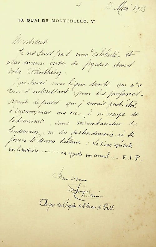 Paul Pisani (1852-1933), historien, prêtre, doyen du chapitre de Notre Dame de Paris. L.A.S., 15 mai 1925, 1p in-8. N'étant pas une célébrité, il ne souhaite pas faire partie du Panthéon de son correspondant. [400]