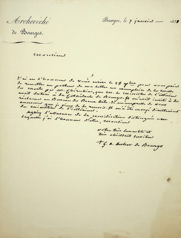 Guillaume-Aubin de Villèle (1770-1841), prélat, archevêque de Bourges. L.A.S., Bourges, 7 janvier 1838, 1p in-4. Il réclame à son correspondant l'exemplaire de la messe des morts de Luigi Cherubini que le ministre de l'intérieur destine à la cathédrale de Bourges. [400]