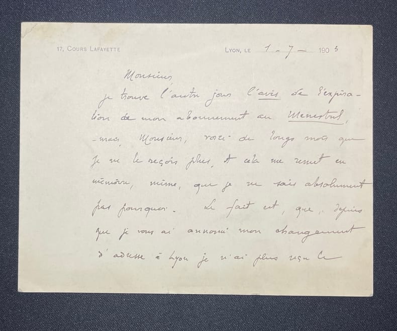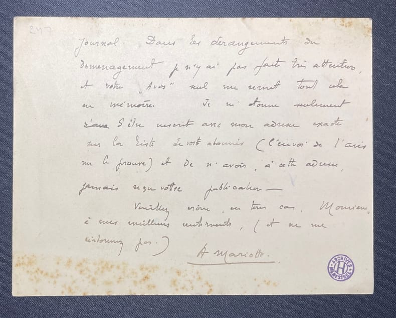 Antoine Mariotte (1875-1944), compositeur. L.A.S., 1er juillet 1903, 2p in-12. A Henri Heugel (1844-1916) avec cachet « archives Menestrel ». « Monsieur, Je trouve l'autre jour l'avis de l'expiration de mon abonnement au Ménestrel, mais, Monsieur, voici de longs mois que je ne le reçois plus, et cela me remet en mémoire, même, que je ne sais absolument pas pourquoi. Le fait est, que, depuis que je vous ai annoncé mon changement d'adresse à Lyon, je n'ai plus reçu le journal. Dans les dérangements du déménagement, je n'y ai pas fait très attention et votre "avis" seul me remet tout cela en mémoire. Je m'étonne seulement d'être inscrit avec mon adresse exacte sur la liste de vos abonnés (l'envoi de l'avis me le prouve) et de n'avoir, à cette adresse, jamais reçu votre publication. Veuillez croire, en tous cas, Monsieur, à mes meilleurs sentiments (et ne me réabonnez pas). A Mariotte ». [379]