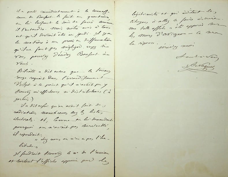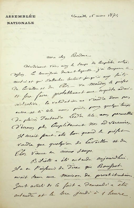 Alfred Naquet (1834-1916), chimiste, médecin, homme politique, promoteur du divorce. L.A.S., Versailles, 16 mars 1874, 2pœ in-8. A Philippe Bordone (1821-1892), médecin, chirurgien militaire dit le général Bordone. Très intéressante lettre faisant suite à la révocation du maire de Cavaillon, Aimé Boussot (1812-1892), par Mac-Mahon en février et les magouilles politiques de l'époque (les élections de 1871 dans le Vaucluse avaient déjà été invalidées par exemple). « Mon cher Bordone, Décidément, vous avez le temps de compléter votre dossier. La commission devant laquelle j'ai comparu le matin et qui s'attache surtout jusqu'ici aux faits de Cavaillon et du Thor va mander le préfet et fera faire probablement une enquête administrative. La validation ne viendra donc pas encore et si cela nous prive pour quelques temps du plaisir d'entendre [Alexandre] Ledru[-Rollin], cela nous permettra d'écraser plus complètement nos adversaires. Il serait peut-être bon quand le préfet viendra que quelqu'un de Cavaillon et du Thor vienne en même temps. [Raoul de] Billioti a été entendu aujourd'hui. Il a eu l'infamie de dire que Boussot avait tenue une maison de prostitution. [Alphonse] Gent averti de ce fait a demandé à être entendu et le sera jeudi [19 mars] à 1 heure. Il a porté immédiatement à la connaissance de Boussot le fait en question en lui laissant le soin de faire comme il l'entendra. Mais notre avis à tous est qu'il devrait être ici jeudi. Il y a la matière à un procès en diffamation qu'il ne faut pas négliger. Voyez si vous pouvez décider Boussot à venir. Biliotti a dit encore que la terreur rouge réglait dans l'arrondissement d'Apt à ce point qu'il n'avait pu y trouver d'afficheurs ni distributeurs (à Pertuis). Il a dit enfin qu'on avait fait des radiations nombreuses sur les listes électorales. Et , comme on lui demandait pourquoi on n'avait pas surveillé, il répondait : « Chez nous on n'en a pas l'habitude » Il faudrait trouver le n° de l'union et surtout l'affiche apposée par les légitimistes et qui incitent les citoyens à aller se faire inscrire. Une telle affiche a été apposée sur les murs d'Avignon. Ce sera la réponse. Ecrivez-moi. Tout à vous A Naquet ». Peu commun [401]