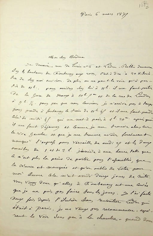 Alfred Naquet (1834-1916), chimiste, médecin, homme politique, promoteur du divorce. L.A.S., Paris, 6 mars 1874 [curieusement mal datée 1875], 3p in-8. A Philippe Bordone (1821-1892), médecin, chirurgien militaire dit le général Bordone. Longue et très intéressante lettre autour des tentatives d'invalidation des élections législatives dans le Vaucluse. Il indique comment rencontrer Alexandre Ledru-Rollin (1807-1874), député du Vaucluse depuis le 1er mars, qui vit à Fontenay-aux-Roses, mentionnant Jean-Baptiste Saint-Martin (1840-1926), futur député du Vaucluse, les « infamies commises » par les légitimistes (non nommés ici mais il s'agit bien d'eux) qu'il faut documenter précisément afin que Naquet en parle à la tribune de l'assemblée. Peu commun [401]