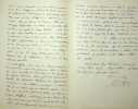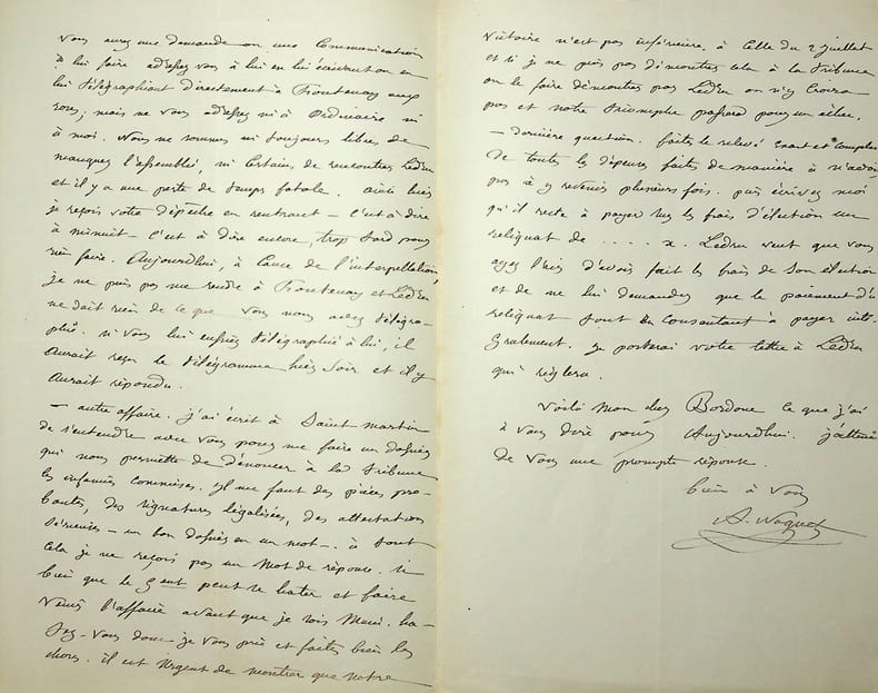 Alfred Naquet (1834-1916), chimiste, médecin, homme politique, promoteur du divorce. L.A.S., Versailles, 16 mars 1874, 2pœ in-8. A Philippe Bordone (1821-1892), médecin, chirurgien militaire dit le général Bordone. Très intéressante lettre faisant suite à la révocation du maire de Cavaillon, Aimé Boussot (1812-1892), par Mac-Mahon en février et les magouilles politiques de l'époque (les élections de 1871 dans le Vaucluse avaient déjà été invalidées par exemple). « Mon cher Bordone, Décidément, vous avez le temps de compléter votre dossier. La commission devant laquelle j'ai comparu le matin et qui s'attache surtout jusqu'ici aux faits de Cavaillon et du Thor va mander le préfet et fera faire probablement une enquête administrative. La validation ne viendra donc pas encore et si cela nous prive pour quelques temps du plaisir d'entendre [Alexandre] Ledru[-Rollin], cela nous permettra d'écraser plus complètement nos adversaires. Il serait peut-être bon quand le préfet viendra que quelqu'un de Cavaillon et du Thor vienne en même temps. [Raoul de] Billioti a été entendu aujourd'hui. Il a eu l'infamie de dire que Boussot avait tenue une maison de prostitution. [Alphonse] Gent averti de ce fait a demandé à être entendu et le sera jeudi [19 mars] à 1 heure. Il a porté immédiatement à la connaissance de Boussot le fait en question en lui laissant le soin de faire comme il l'entendra. Mais notre avis à tous est qu'il devrait être ici jeudi. Il y a la matière à un procès en diffamation qu'il ne faut pas négliger. Voyez si vous pouvez décider Boussot à venir. Biliotti a dit encore que la terreur rouge réglait dans l'arrondissement d'Apt à ce point qu'il n'avait pu y trouver d'afficheurs ni distributeurs (à Pertuis). Il a dit enfin qu'on avait fait des radiations nombreuses sur les listes électorales. Et , comme on lui demandait pourquoi on n'avait pas surveillé, il répondait : « Chez nous on n'en a pas l'habitude » Il faudrait trouver le n° de l'union et surtout l'affiche apposée par les légitimistes et qui incitent les citoyens à aller se faire inscrire. Une telle affiche a été apposée sur les murs d'Avignon. Ce sera la réponse. Ecrivez-moi. Tout à vous A Naquet ». Peu commun [401]